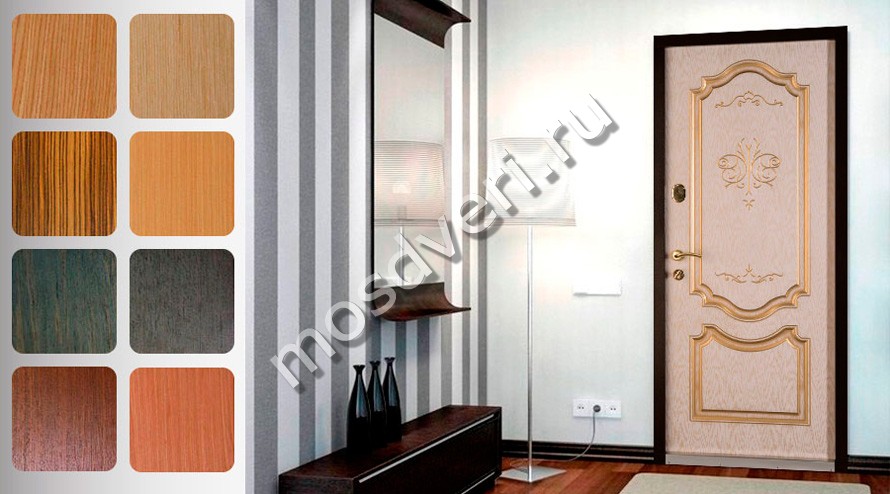 В категории отделок представлены: красный шагрень, серебро с напылением, классика с молдингом. Наружное покрытие может быть из порошка или пленки. Для помещения в стиле лофт подойдет матовый графит. Красивые варианты с отделкой под сандал или ясень имеют текстуру натурального дерева. Другие популярные виды: темный орех и беленый дуб. Эмаль наносится в несколько слоев.